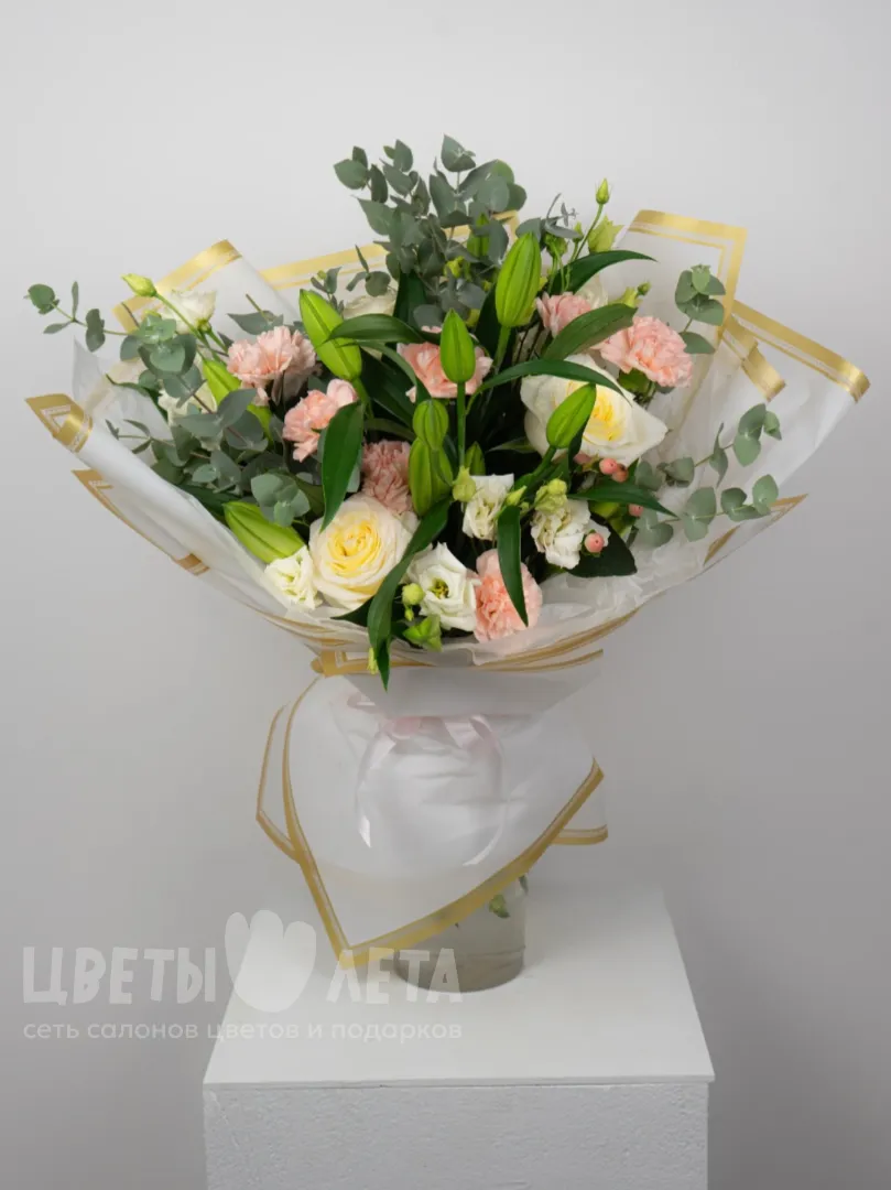 Состав букета может незначительно меняться в зависимости от сезонности и наличия цветов. Пожалуйста, уточняйте состав и наличие у наших менеджеров или в социальных сетях.
