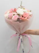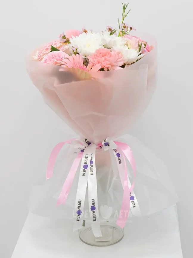 Букет «Дыхание весны»: нежное переплетение розовых гербер, роз, диантусов и белых хризантем, способное выразить чувства без слов.