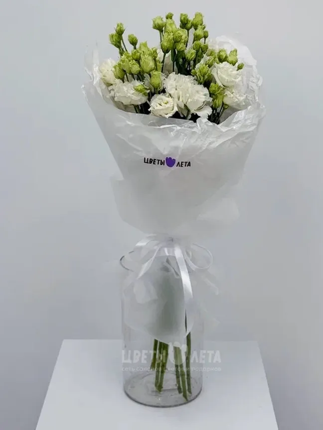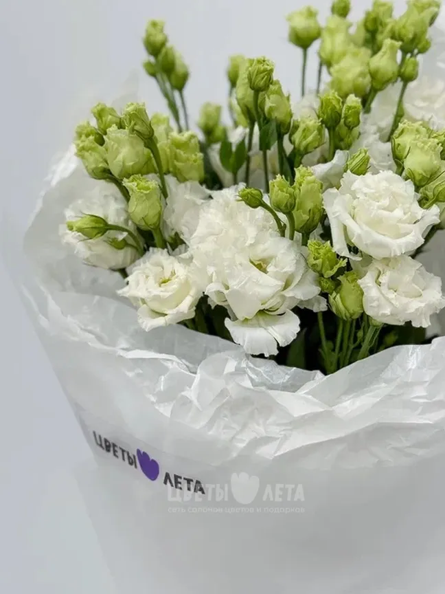 Элегантный букет из белой эустомы – это воплощение изысканного вкуса и безупречного стиля. Нежные, словно шелк, цветы грациозно сочетаются в этой композиции, создавая атмосферу роскоши и утонченности. Прекрасный выбор для особых случаев.