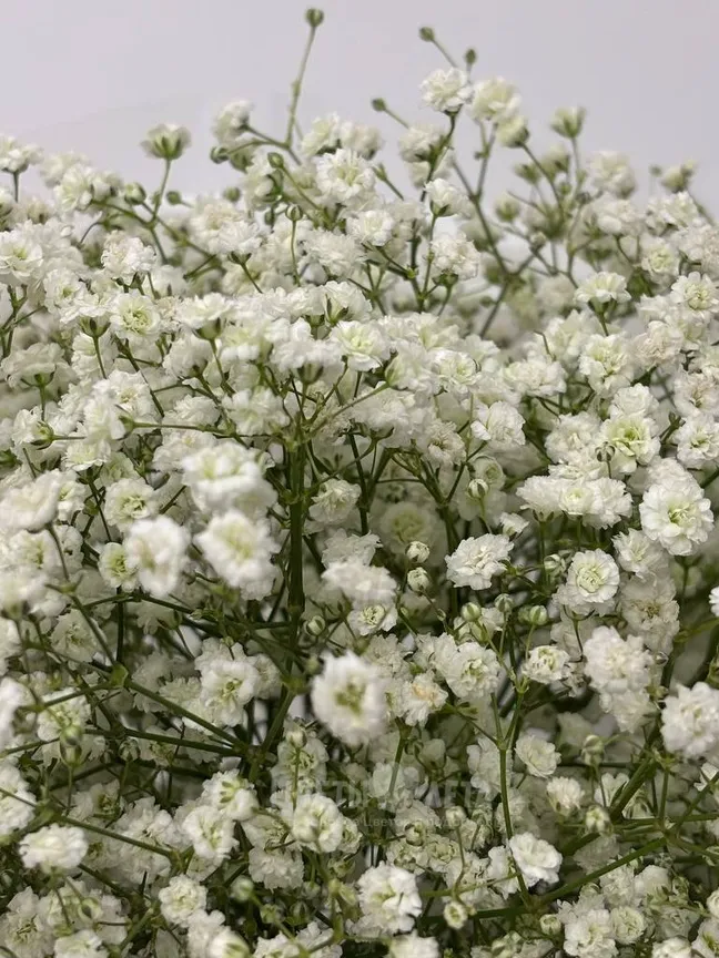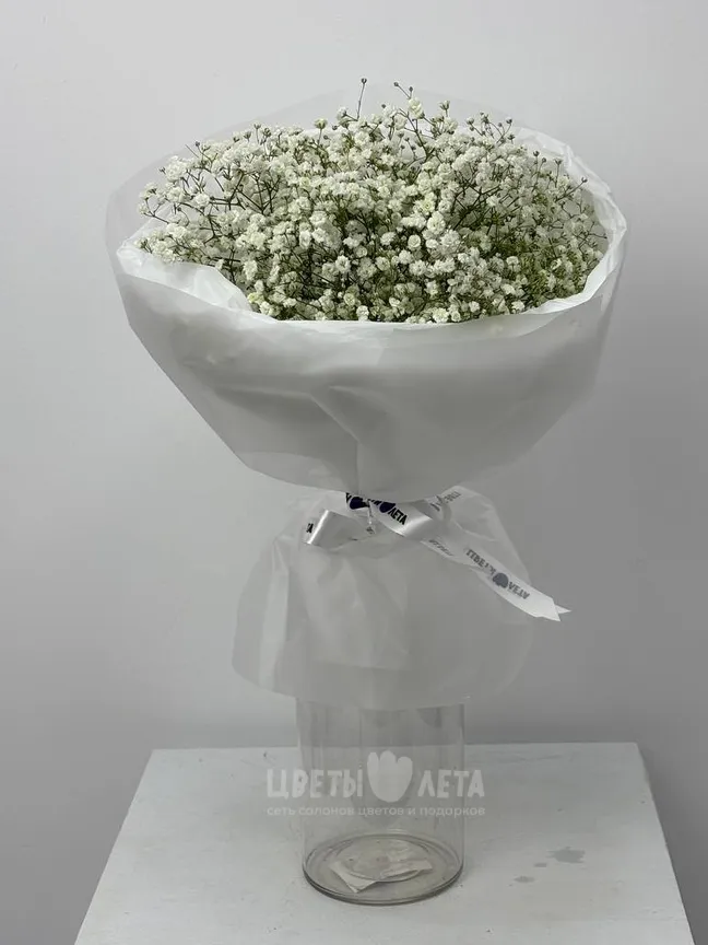 Этот воздушный букет состоит из белоснежной гипсофилы. Цветы отличаются нежным ароматом и высокой стойкостью. Букет перевязан атласной лентой и станет прекрасным подарком для тех, кто ценит красоту и изысканность.