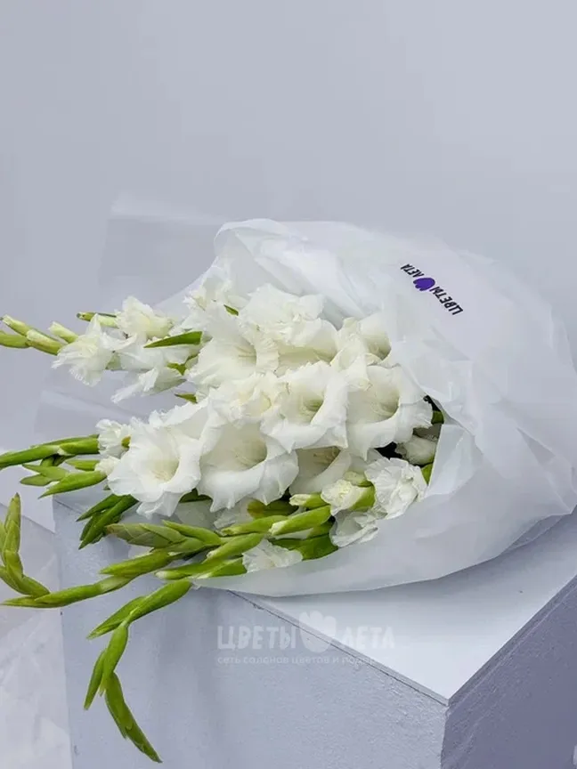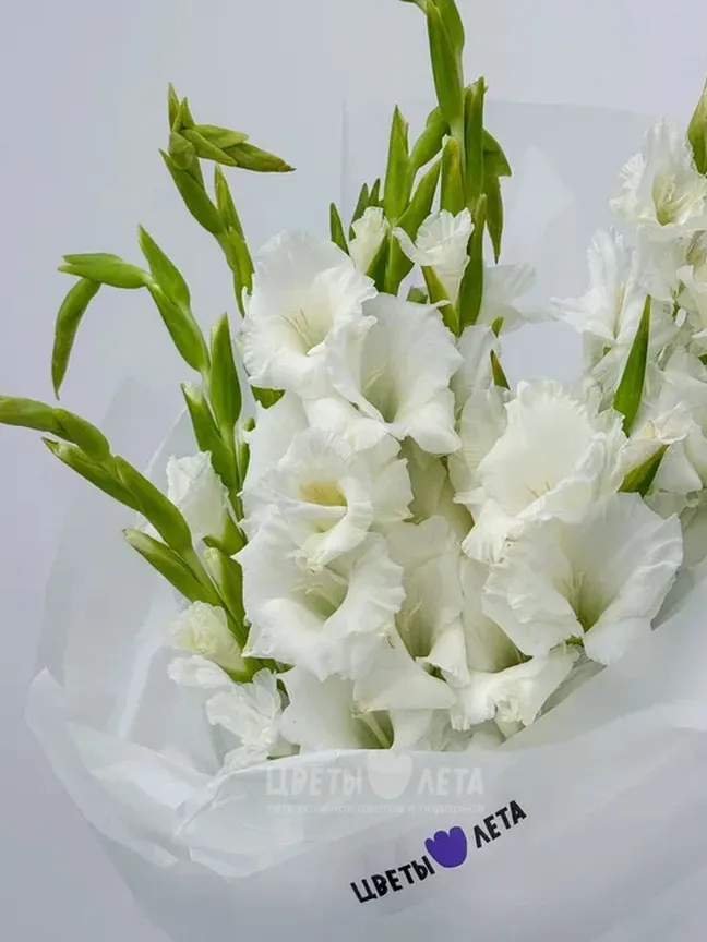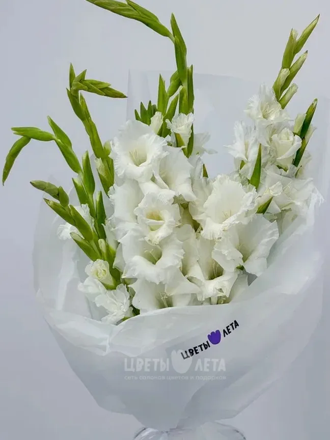 Воплощение чистоты и изысканности - этот букет из белоснежных гладиолусов. Их стройные силуэты и нежные лепестки создают атмосферу торжественности и гармонии. Идеальный выбор для особых случаев, свадеб или просто для того, чтобы подарить немного красоты и света.