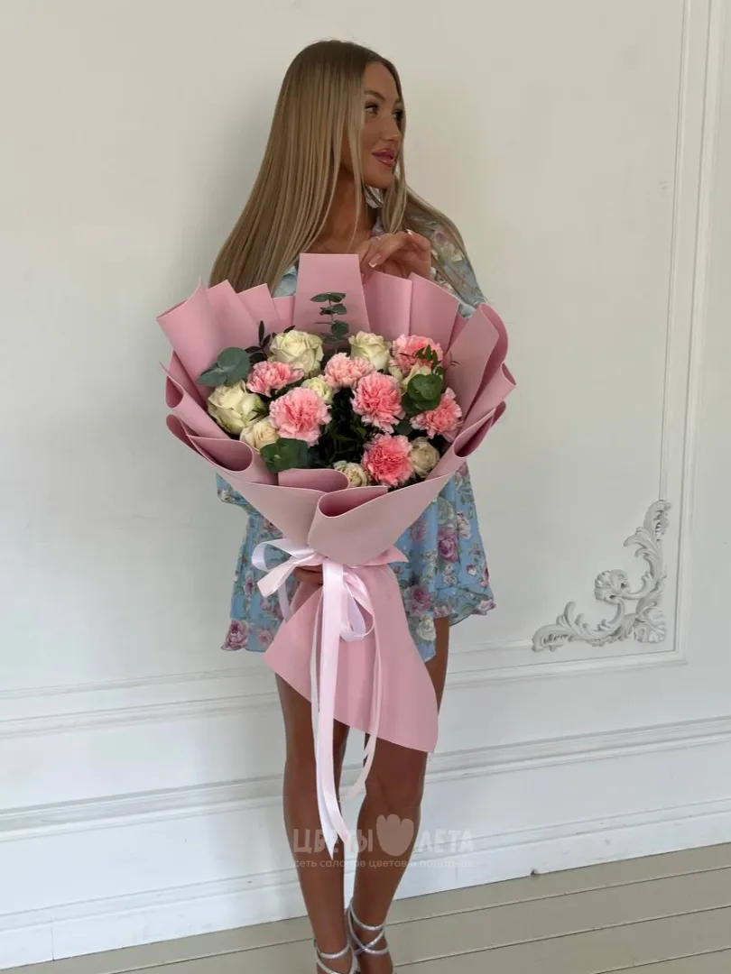 Букет «Зефирный» - это гармоничное сочетание белоснежных роз и нежно-розовых гвоздик. Воздушные, как зефир, цветы создают ощущение легкости и безмятежности. Идеальный подарок для тех, кто любит нежные и изысканные композиции.