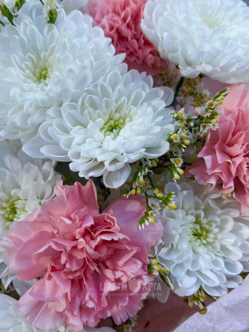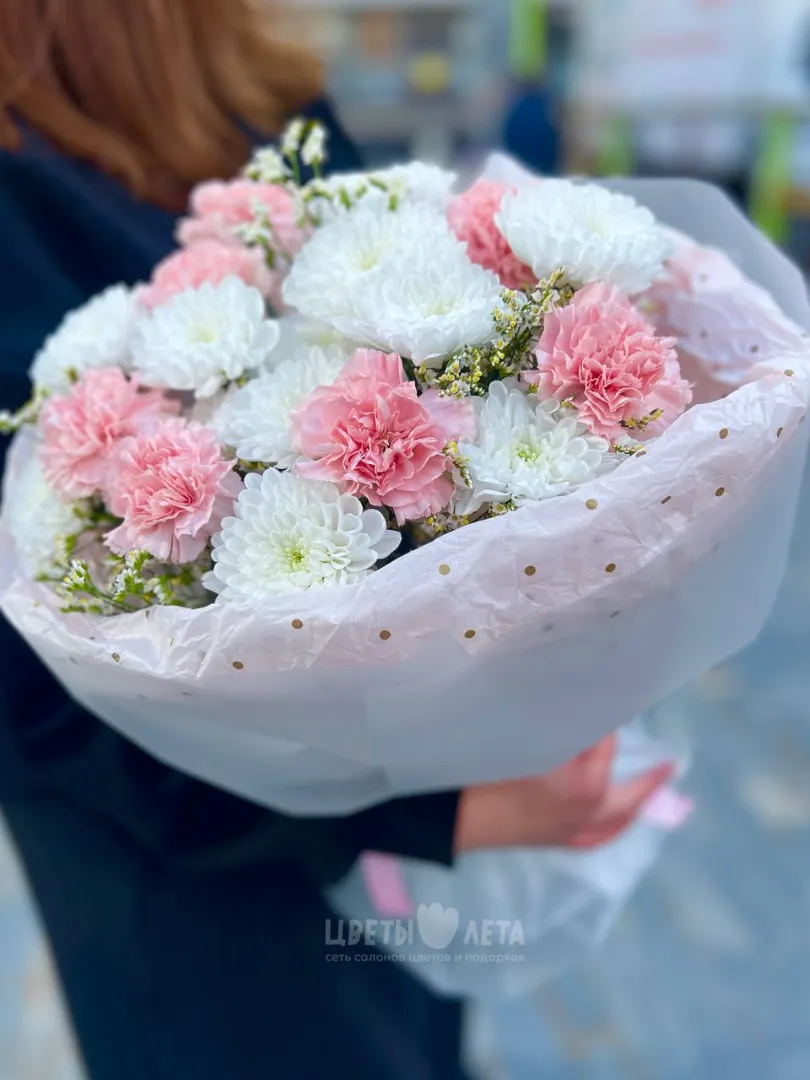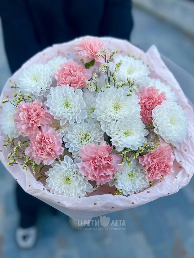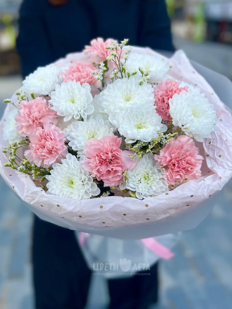 Выразите свое восхищение и признательность настоящей леди с этим изысканным букетом! Белые хризантемы и розовые гвоздики – это символ уважения, благодарности и самых искренних чувств. Этот букет станет прекрасным способом выразить свою признательность и восхищение.