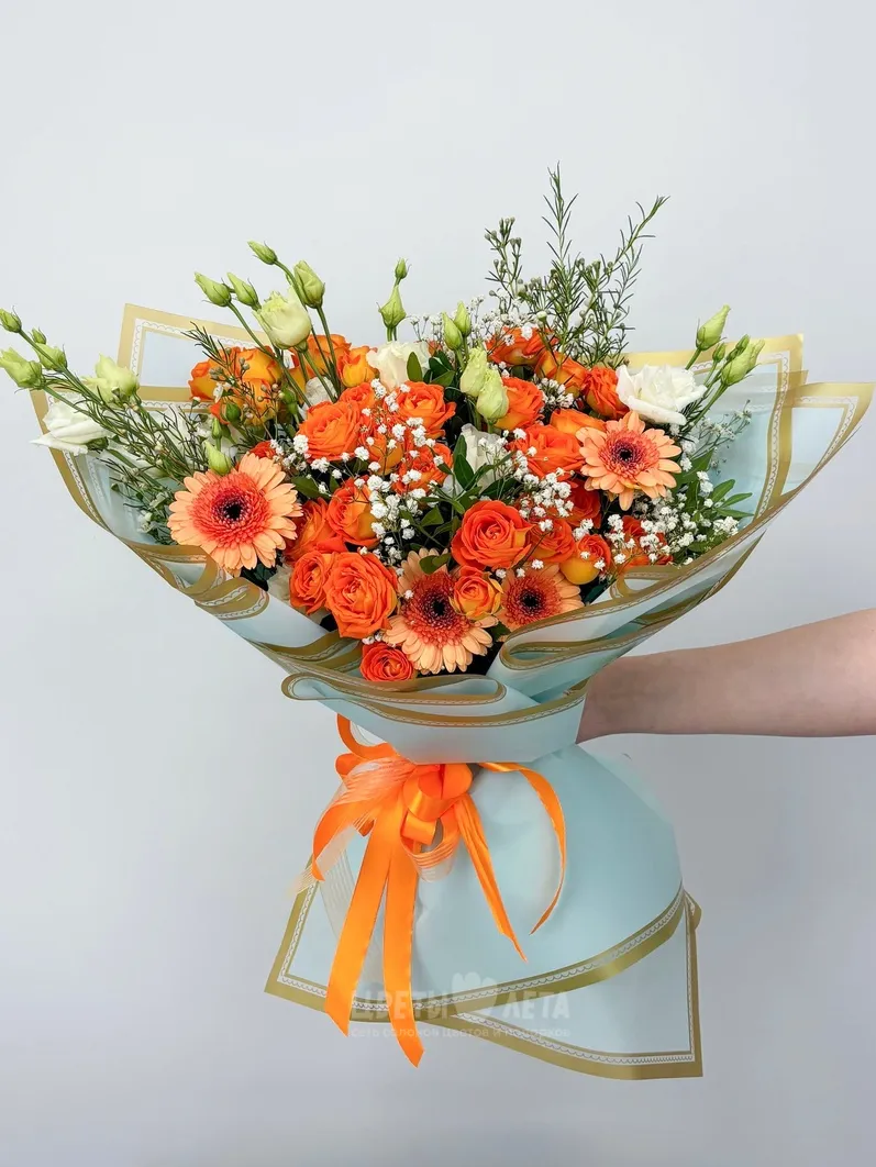 Почувствуйте дыхание осени с букетом «Тыковка»! Оранжевые кустовые розы и герберы, воздушная гипсофила и нежная эустома, словно осенние листья, переливаются теплыми оттенками. Этот букет – как воспоминание о ярких осенних днях, о теплых вечерах у камина. Он создан для тех, кто ценит красоту осенней природы.