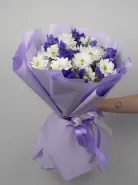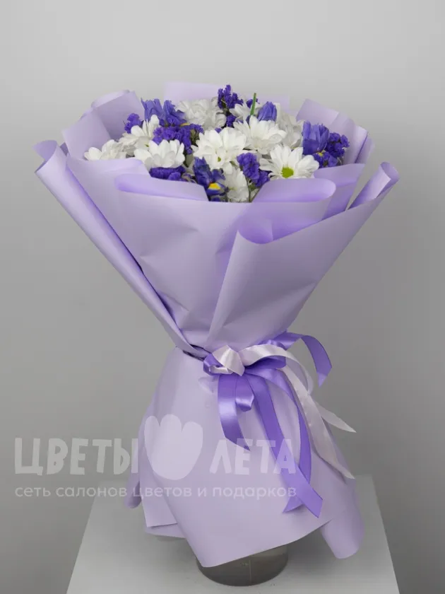 «Ощутите летний бриз с букетом »Полевая свежесть"! Белые ромашковые хризантемы, нежно-голубые ирисы и воздушная статица создают ощущение легкости, свободы и близости к природе. Этот букет – как глоток свежего воздуха в жаркий день.