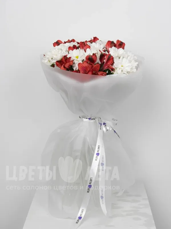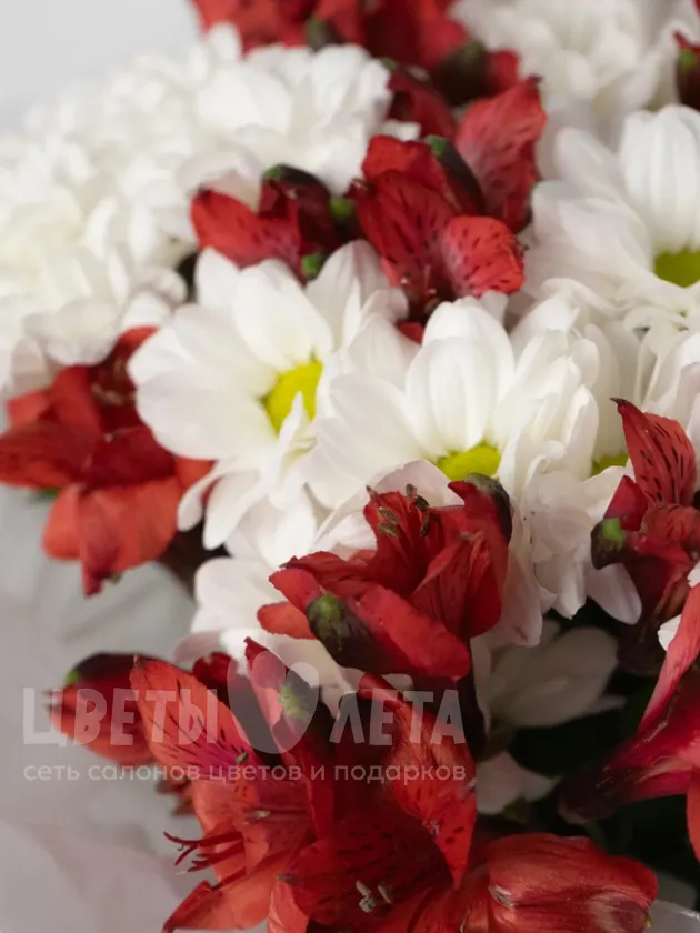 Подарите взрыв эмоций с этим ярким букетом! Ромашковые хризантемы, словно маленькие солнышки, в сочетании с алыми альстромериями создают атмосферу радости, тепла и оптимизма.