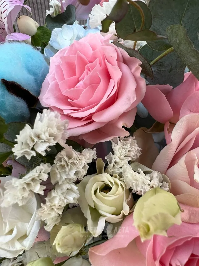 Состав композиции может незначительно меняться в зависимости от сезонности и наличия цветов. Пожалуйста, уточняйте состав и наличие у наших менеджеров или в социальных сетях