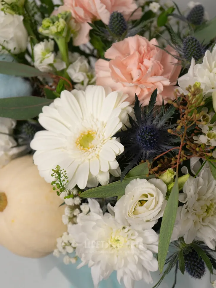 Состав композиции может незначительно меняться в зависимости от сезонности и наличия цветов. Пожалуйста, уточняйте состав и наличие у наших менеджеров или в социальных сетях.