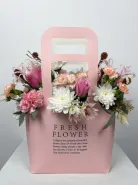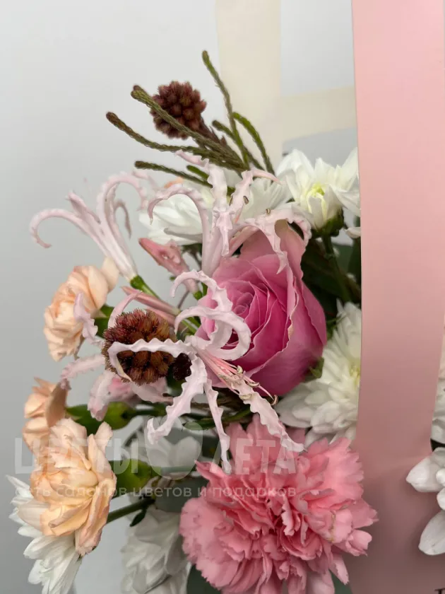 Состав композиции может незначительно меняться в зависимости от сезонности и наличия цветов. Пожалуйста, уточняйте состав и наличие у наших менеджеров или в социальных сетях.