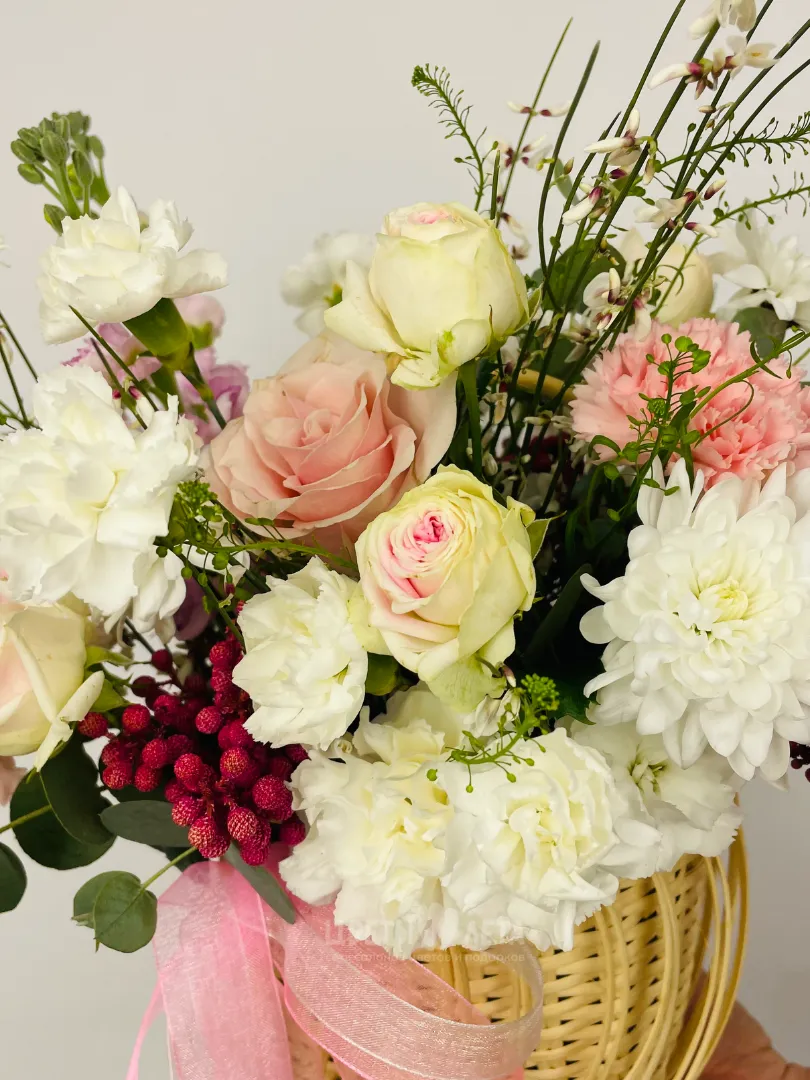 Состав может незначительно меняться, в зависимости от поставок и сезонности цветов, поэтому актуальное наличие уточняйте пожалуйста у менеджеров или в соцсетях.